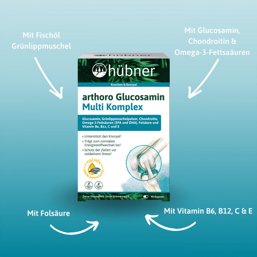 Tipp: Zur bestmöglichen Nahrungsergänzung sollten hübner® arthoro Glucosamin Multi Komplex Kapseln über mehrere Monate verzehrt werden.