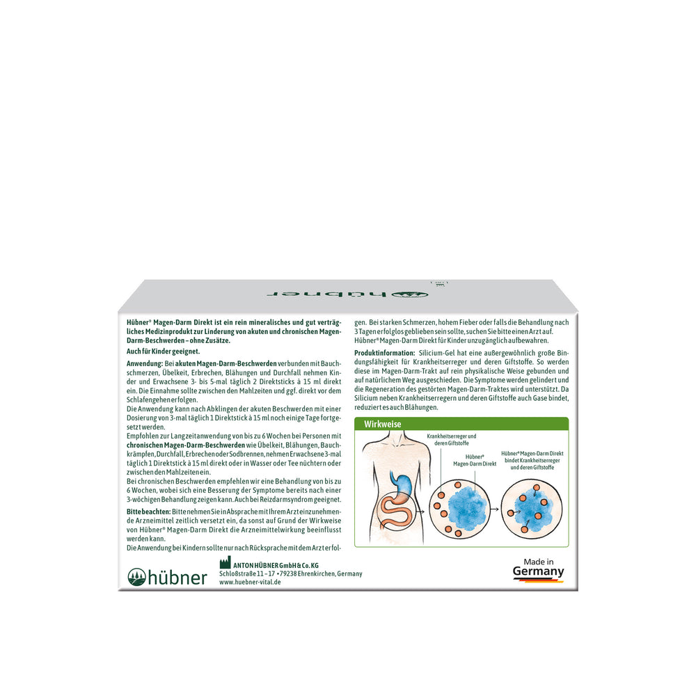Die Anwendung bei Kindern sollte nur nach Rücksprache mit dem Arzt erfolgen. Bei starken Schmerzen, hohem Fieber oder falls die Behandlung nach 3 Tagen erfolglos geblieben sein sollte, suchen Sie bitte einen Arzt auf. Während der langjährigen Anwendung dieses Medizinproduktes sind keine schädigenden Wirkungen bekannt geworden. Das Produkt soll in der Schwangerschaft und Stillzeit erst nach Rücksprache mit Ihrem Arzt angewendet werden. Bitte nehmen Sie in Absprache mit Ihrem Arzt einzunehmende Arzneimittel zeitlich versetzt ein, da sonst auf Grund der Wirkweise von hübner® Magen-Darm Direkt die Arzneimittelwirkung beeinflusst werden kann.