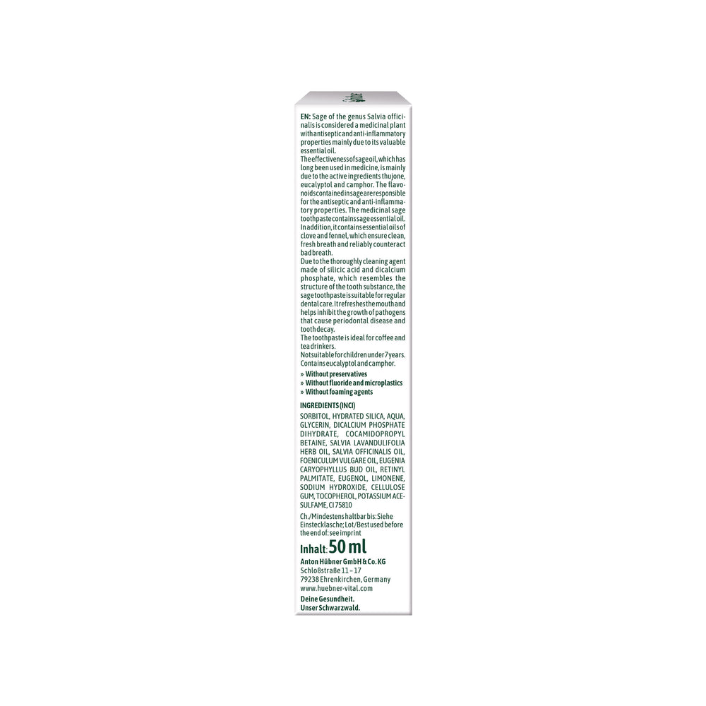 Mentholfreie Zahnpasta, ideal für Teetrinker geeignet. Der Putzkörper aus Kieselsäure und Dicalciumphosphat ist zahnfreundlich und kommt ohne Konservierungsstoffe aus. Salbei enthält wertvolle ätherische Öle und gilt deshalb als Heilpflanze mit entzündungswidrigen und antiseptischen Eigenschaften. Damit unterstützt es Sie bei der Mundpflege.
