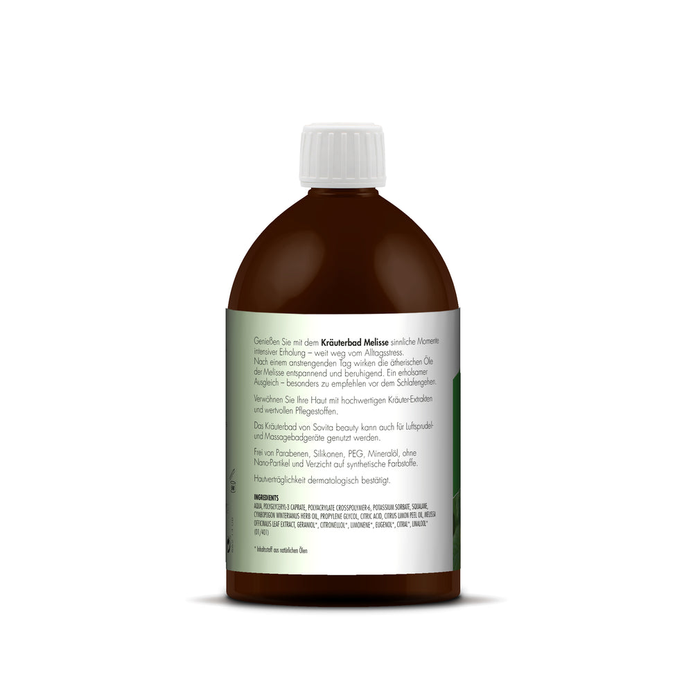 Genießen Sie mit dem Kräuterbad Melisse sinnliche Momente intensiver Erholung – weit weg vom Alltagsstress. Nach einem anstrengenden Tag wirken die ätherischen Öle der Melisse entspannend und beruhigend. Ein erholsamer Ausgleich – besonders zu empfehlen vor dem Schlafengehen. Verwöhnen Sie Ihre Haut mit hochwertigen Kräuter-Extrakten und wertvollen Pflegestoffen. Das Kräuterbad von Sovita beauty kann auch für Luftsprudel- und Massagebadgeräte genutzt werden.