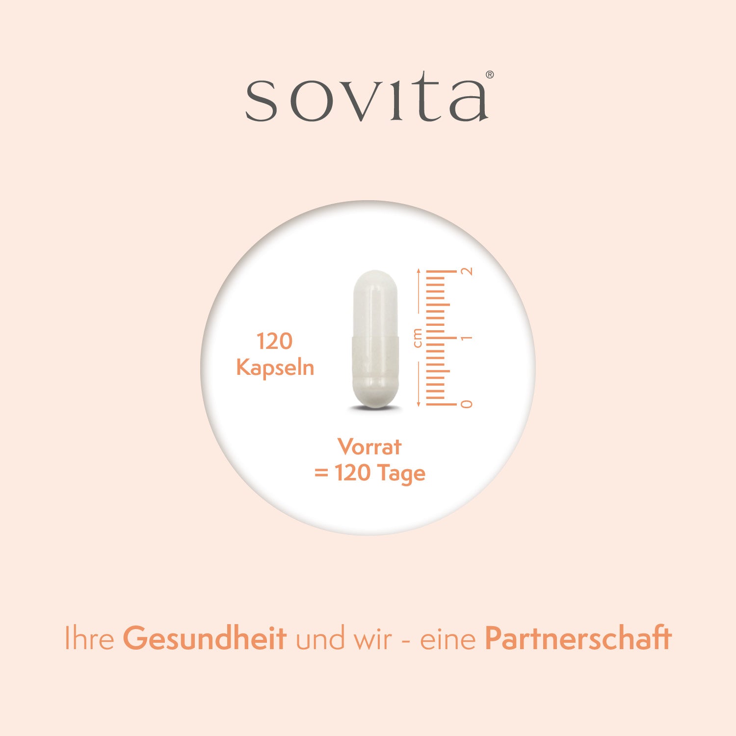 Produktabbildung der sovita Vitamin C 300 Langzeit-Kapseln mit drei transparenten Kapseln, die kleine weiße Kügelchen enthalten