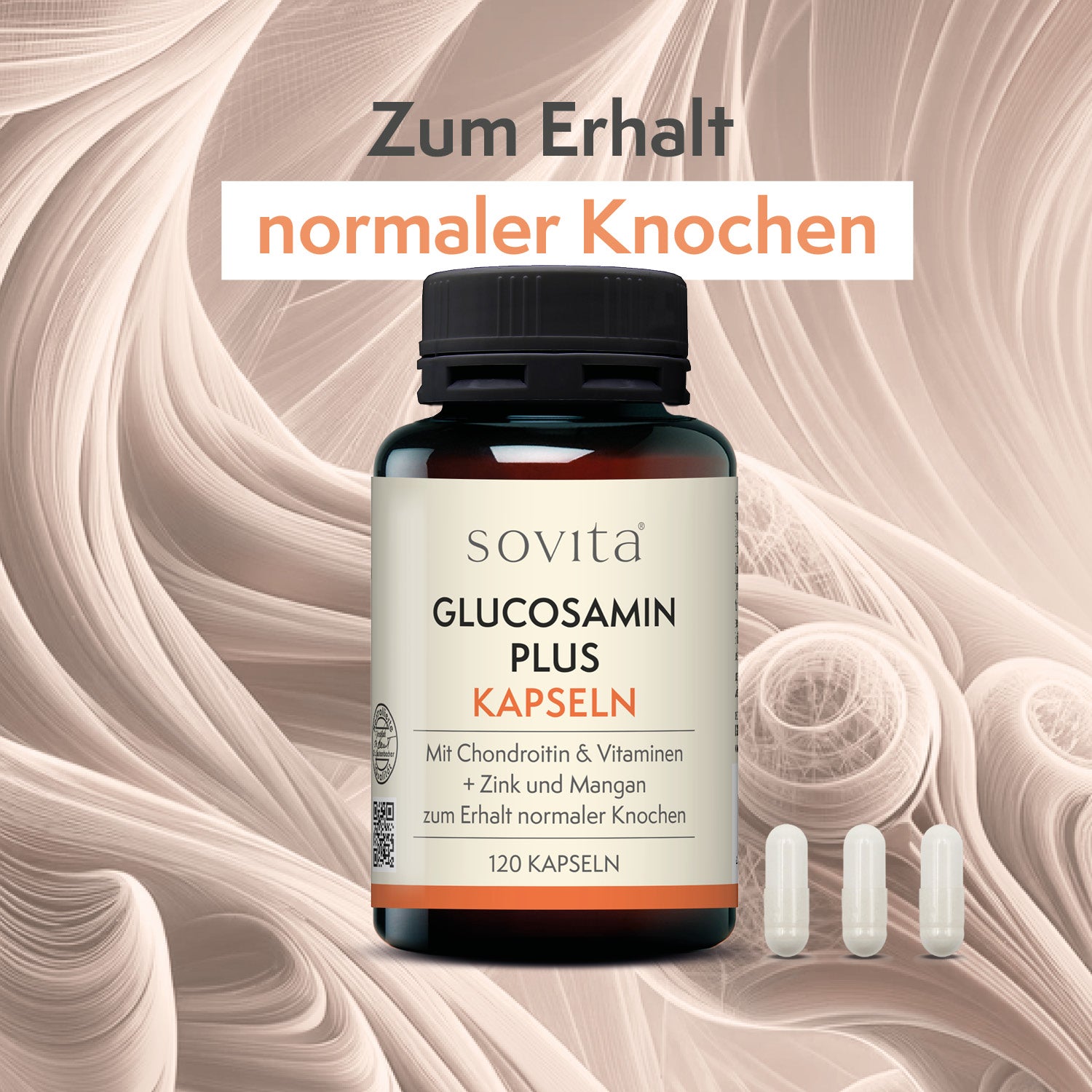 Eine sorgfältig abgestimmte Kombination aus Glucosaminsulfat, Chondroitinsulfat, Vitamin E, Vitamin B6, Zink, Mangan und Kupfer, die wichtigen Funktionen im Körper unterstützt. Die enthaltenen Nährstoffe tragen unter anderem zur Erhaltung normaler Knochen und zum Schutz der Zellen vor oxidativem Stress bei.