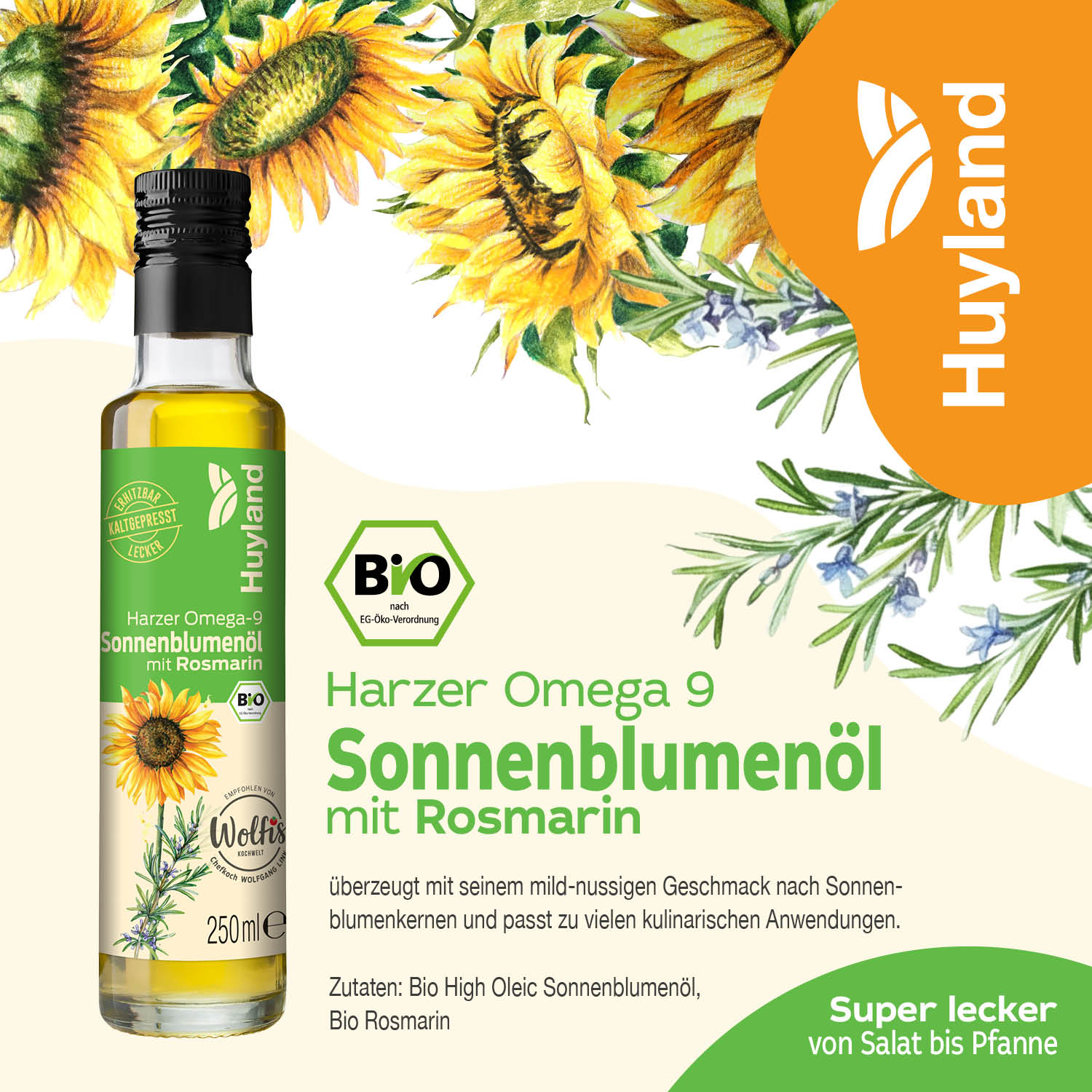 Bio Harzer Omega 9 Sonnenblumenöl mit Rosmarin kombiniert die herzgesunden Vorteile von Ölsäure mit dem würzigen Aroma von Rosmarin. Das Öl ist hitzebeständig und ideal zum Braten, Grillen und Frittieren. Rosmarin wirkt antioxidativ, entzündungshemmend und verdauungsfördernd, was die gesundheitlichen Vorteile zusätzlich verstärkt.