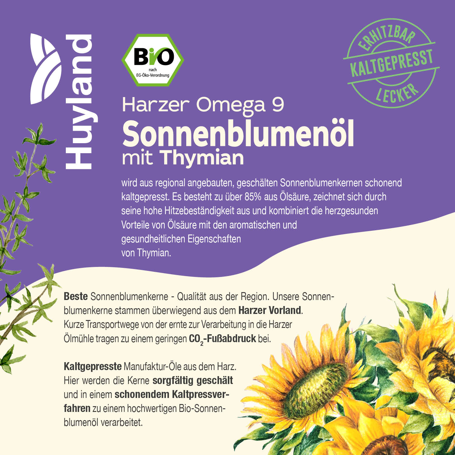 Das Harzer Omega 9 Sonnenblumenöl mit Thymian bietet eine perfekte Mischung aus gesundheitsfördernden Eigenschaften und einem feinen Kräuteraroma. Es verleiht den Gerichten nicht nur Geschmack, sondern unterstützt gleichzeitig eine gesunde Ernährung und eignet sich ideal für die vielseitige mediterrane Küche.
