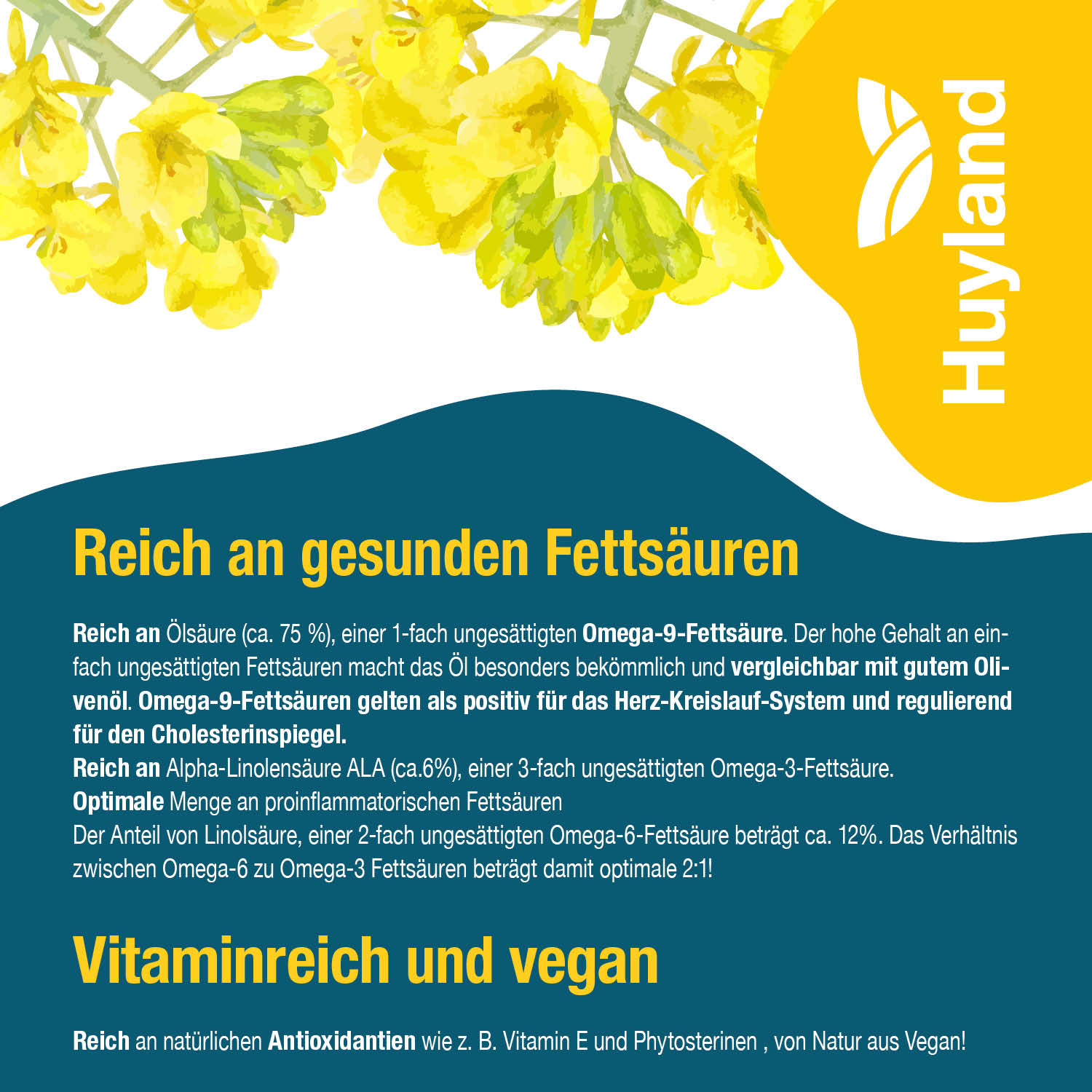 Harzer Omega 9-6-3 Rapsöl ist ein regional angebautes, hochwertiges kaltgepresstes Pflanzenöl und besteht zu über 75,4 % Ölsäure (Omega-9), 12,2 % Linolsäure (Omega-6) und 5,6 % Alpha-Linolensäure (Omega-3) und zeichnet sich durch seine hohe Hitzebeständigkeit aus.