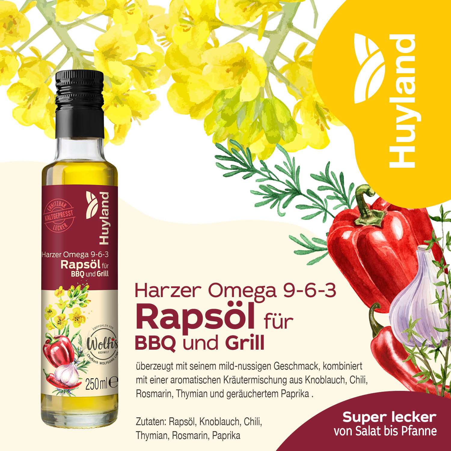 Harzer Rapsöl für BBQ und Grill ist ein hochwertiges Öl, das sich durch seinen hohen Anteil an einfach ungesättigten Fettsäuren auszeichnet. Diese Fettsäuren sind nicht nur gesund, sondern machen das Öl auch hitzebeständig, was es ideal für das Kochen bei hohen Temperaturen wie Grillen oder Braten macht. Mit einer BBQ-Kräutermischung aus Knoblauch, Chili, Rosmarin, Thymian und geräuchertem Paprika wird das Öl zu einer aromatischen Basis für herzhafte, rauchige Gerichte mit einer leicht scharfen Note.