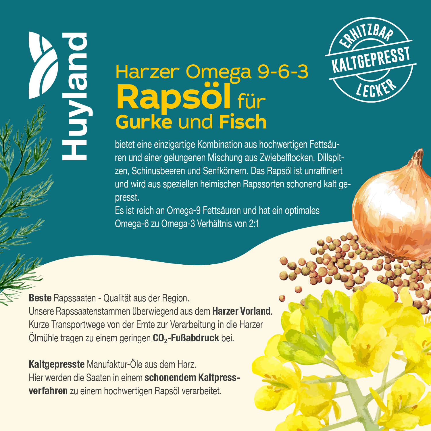 Harzer Rapsöl für Gurke und Fisch ist ein vielseitiges und gesundes Öl, das sich perfekt mit einer aromatischen Kräutermischung aus Zwiebelflocken, Dillspitzen, Schinusbeeren und Senfkörnern kombinieren lässt. Ob für Fischgerichte, Gurkensalate oder würzige Dips—die Möglichkeiten sind vielfältig. Probieren Sie es aus und bringen Sie frischen Wind in Ihre Küche mit diesen köstlichen Aromen!