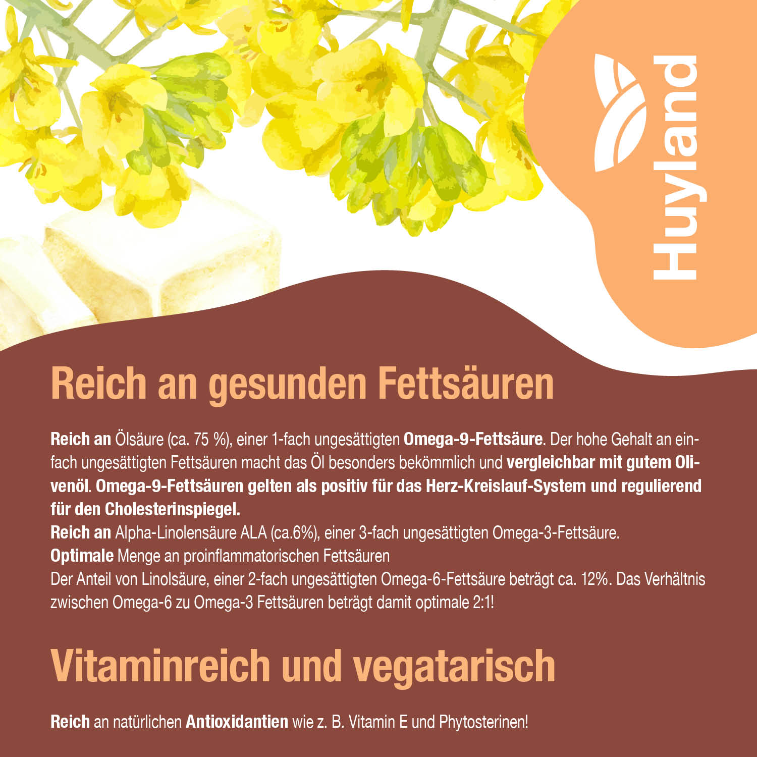 Dieses spezielle Harzer Omega 9-6-3 Rapsöl mit Butteraroma bietet eine einzigartige Kombination aus hochwertigen Fettsäuren und dem Zusatz von Butterschmalz, was ihm einen besonderen Geschmack verleiht und seine Vielseitigkeit in der Küche erhöht. Mit 74,6 % Ölsäure (Omega-9), 12,0 % Linolsäure (Omega-6) und 5,5 % Alpha-Linolensäure (Omega-3) ist dieses Öl ideal für eine ausgewogene Ernährung geeignet. Hier erfährst du mehr über die gesundheitlichen Vorteile, die vielseitigen Verwendungsmöglichkeiten und leckere Rezeptideen.