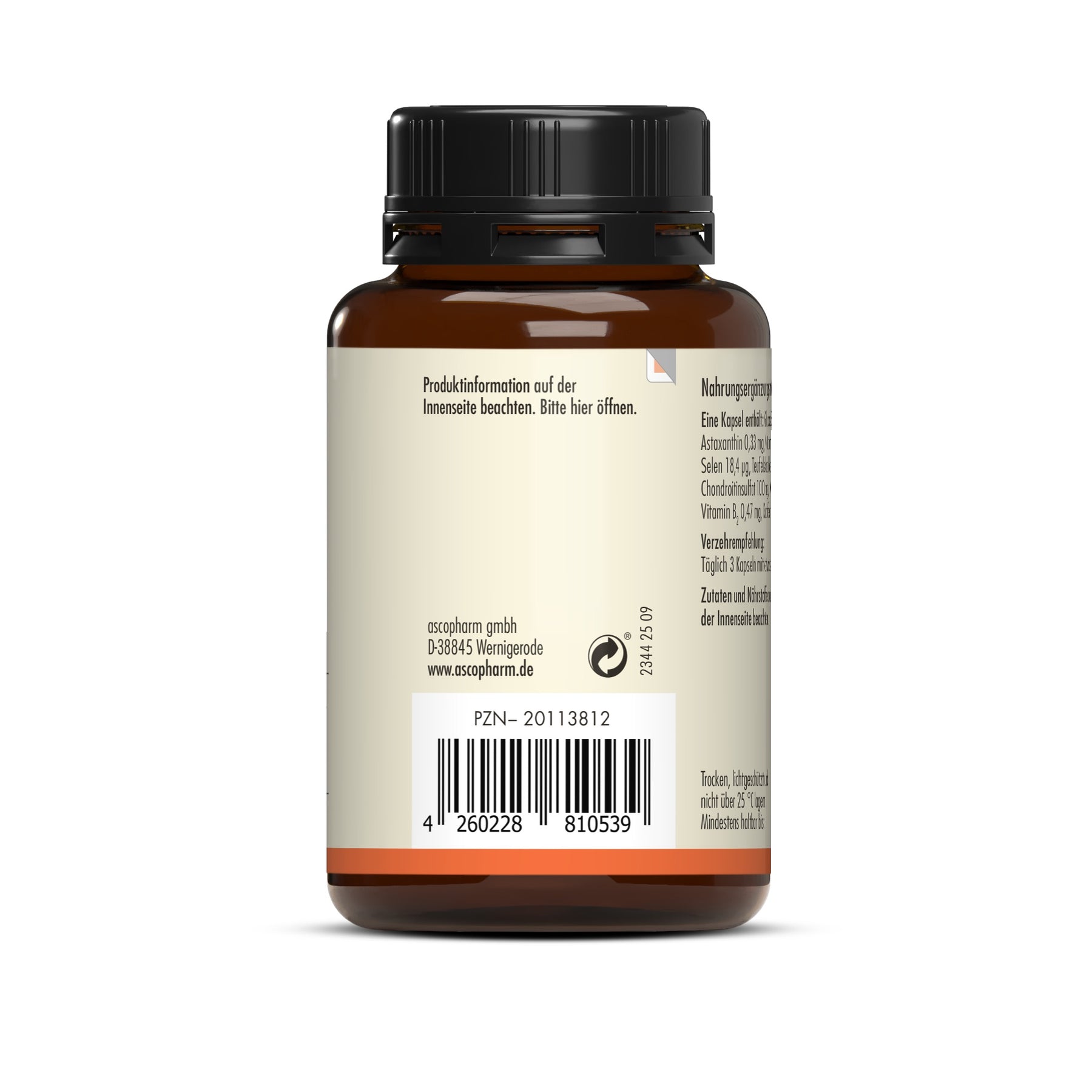 Glucosaminhydrochlorid aus Krebstieren; Überzugsmittel: Hydroxypropylmethylcellulose (pflanzliche Kapselhülle); Chondroitinsulfat; Teufelskrallenextrakt; Vitamin C (L-Ascorbinsäure); Vitamin E (D-alpha-Tocopherylacetat); astaxanthinhaltiger Algenextrakt aus Haematococcus pluvialis; Mangangluconat; Zinkbisglycinat; Kupferbisglycinat; Vitamin B2 (Riboflavin); Natriumselenit.