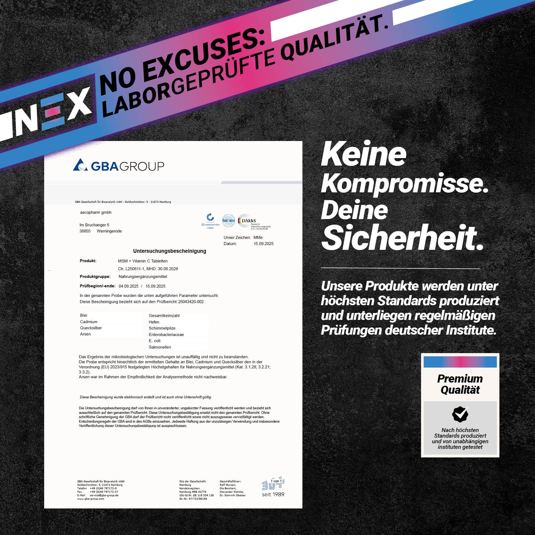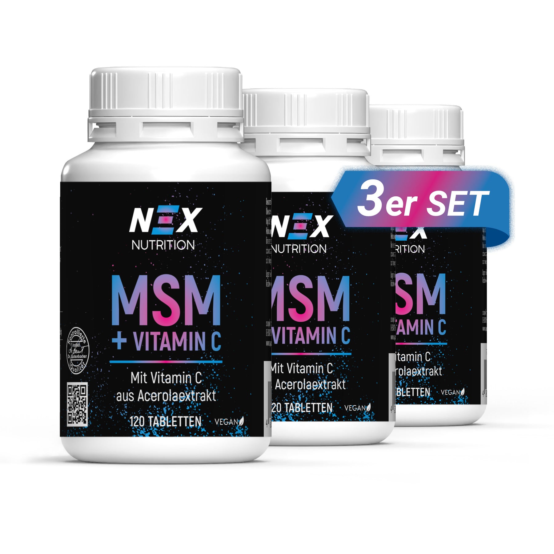 Die MSM + Vitamin C Tabletten von NEX kombinieren 1.000 mg MSM mit natürlichem Vitamin C aus Acerolaextrakt.