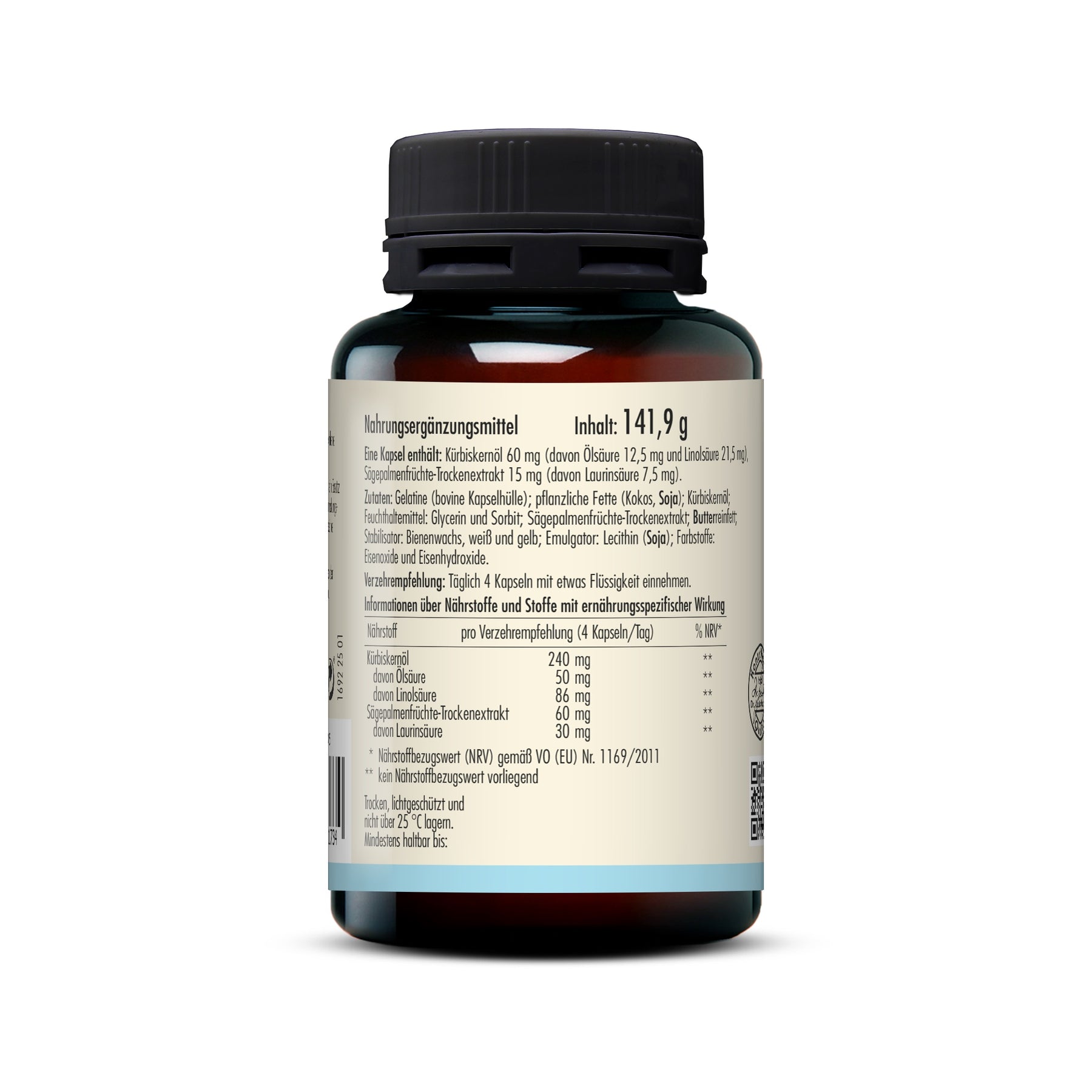 ✔ Mit hochwertigem Kürbiskernöl ✔ Enthält Sägepalmenfrüchte-Trockenextrakt ✔ Natürliche Fettsäuren: Ölsäure, Linolsäure und Laurinsäure ✔ Praktische Kapseln für die tägliche Ergänzung