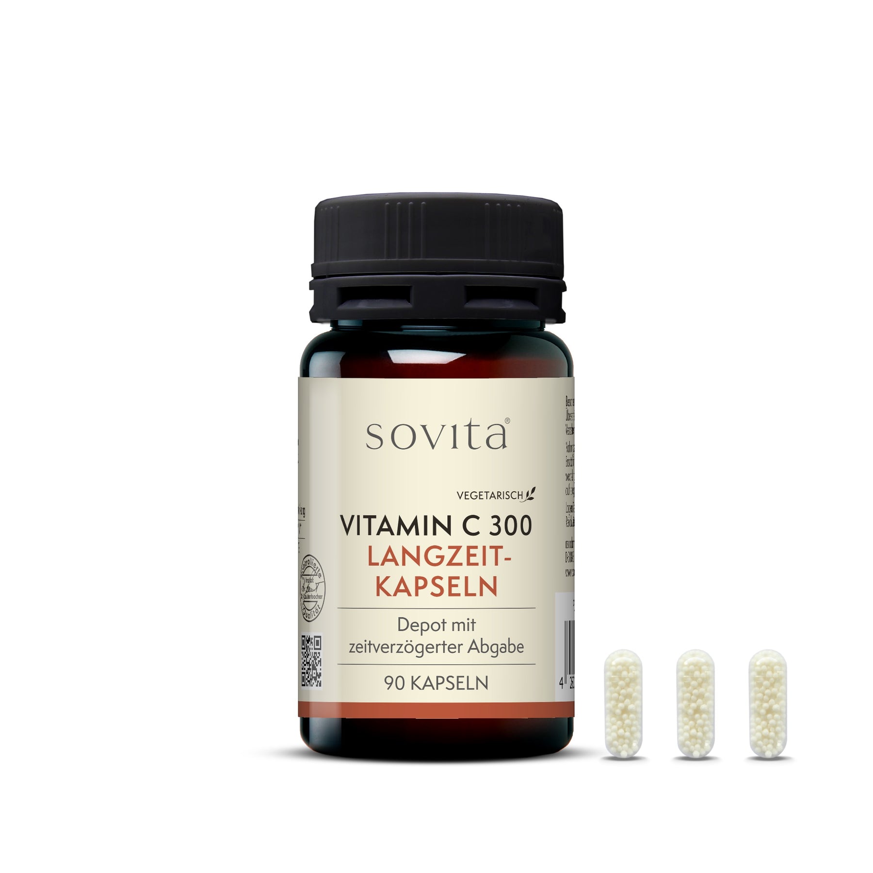 Die sovita Vitamin C Langzeit-Kapseln bieten Vitamin C in einer besonderen Form. Die Kapseln enthalten kleine Perlen, die sich nach dem Verzehr langsam auflösen und so den Organismus über einen längeren Zeitraum mit Vitamin C versorgen. Die Deutsche Gesellschaft für Ernährung empfiehlt, mindestens 100 mg Vitamin C pro Tag aufzunehmen. Bei einer zusätzlichen täglichen Zufuhr von 200 mg leistet Vitamin C auch während und nach intensiver körperlicher Betätigung einen Beitrag zur normalen Funktion des Immunsystems. Mit der hohen Dosierung von 300 mg Vitamin C pro Kapsel dienen die Langzeit-Kapseln zur Ergänzung der Ernährung und decken ein Mehr an benötigter Zufuhrmenge problemlos ab.