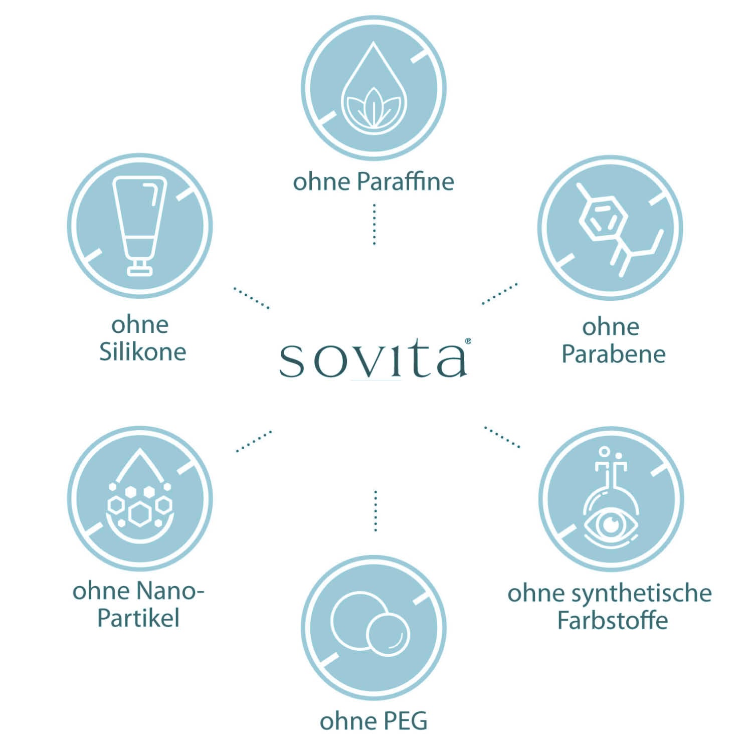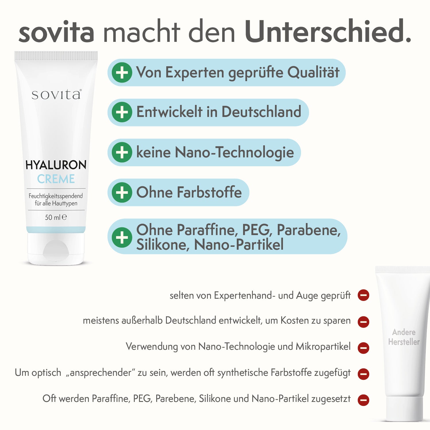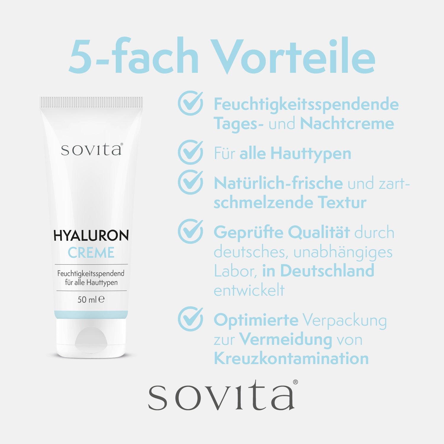 sovita Hyaluron Creme ist eine straffende Tages- und Nachtcreme mit der feuchtigkeitsbindenden Tiefenwirkung der Hyaluronsäure. Die intensive Formel mit pflanzlichen Konjac Mannanen und Milchproteinen mildert sichtbar Fältchen, sorgt für jugendliche Spannkraft sowie Vitalität und ist für jeden Hauttyp geeignet. Kostbare Pflegefaktoren wie Mangokern- und Sheabutter schützen und beruhigen die Haut zusätzlich. Müde und kraftlose Haut erscheint in einem strahlend frischen Teint.