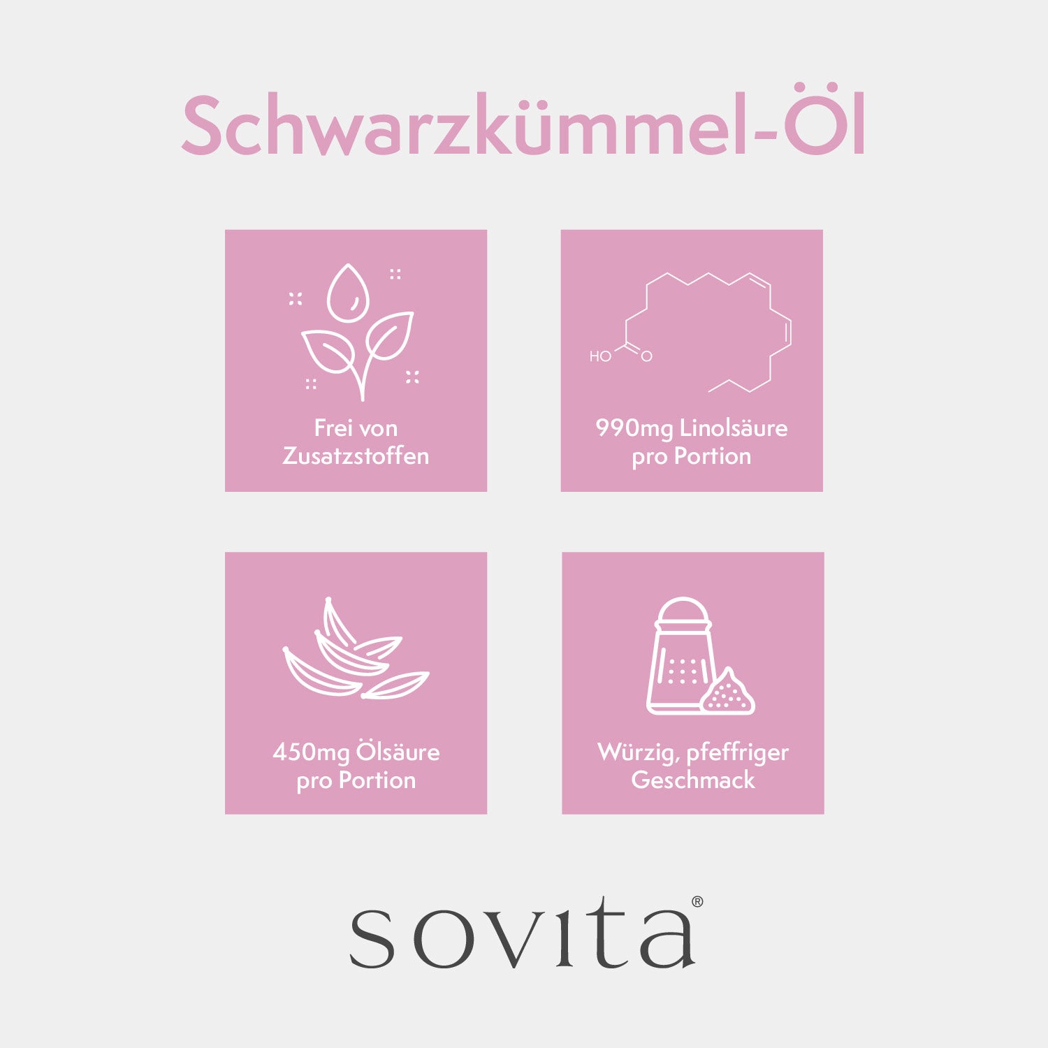 Das sovita Schwarzkümmel-Öl kann pur verzehrt werden. Es bietet mehrere gesundheitliche Vorteile. Der echte Schwarzkümmel (Nigella sativa) gilt als gute Quelle für ungesättigte Fettsäuren wie Linol- und Ölsäure. Er gehört zur Familie der Hahnenfußgewächse und ist in Nordafrika, Südeuropa und Vorderasien beheimatet. Schon die Pharaonen im alten Ägypten schätzten die kleinen, schwarzen Samen mit den kostbaren Inhaltsstoffen. Das hochwertige, kaltgepresste Öl in Reinform ist eine Alternative zu den Kapselprodukten.
