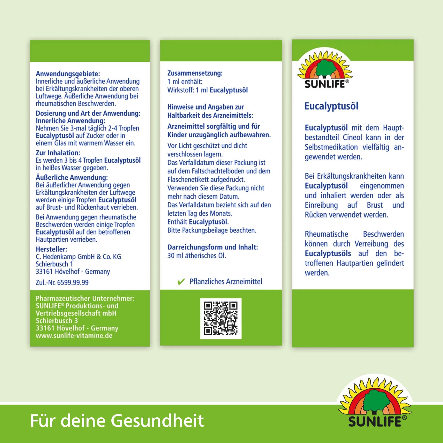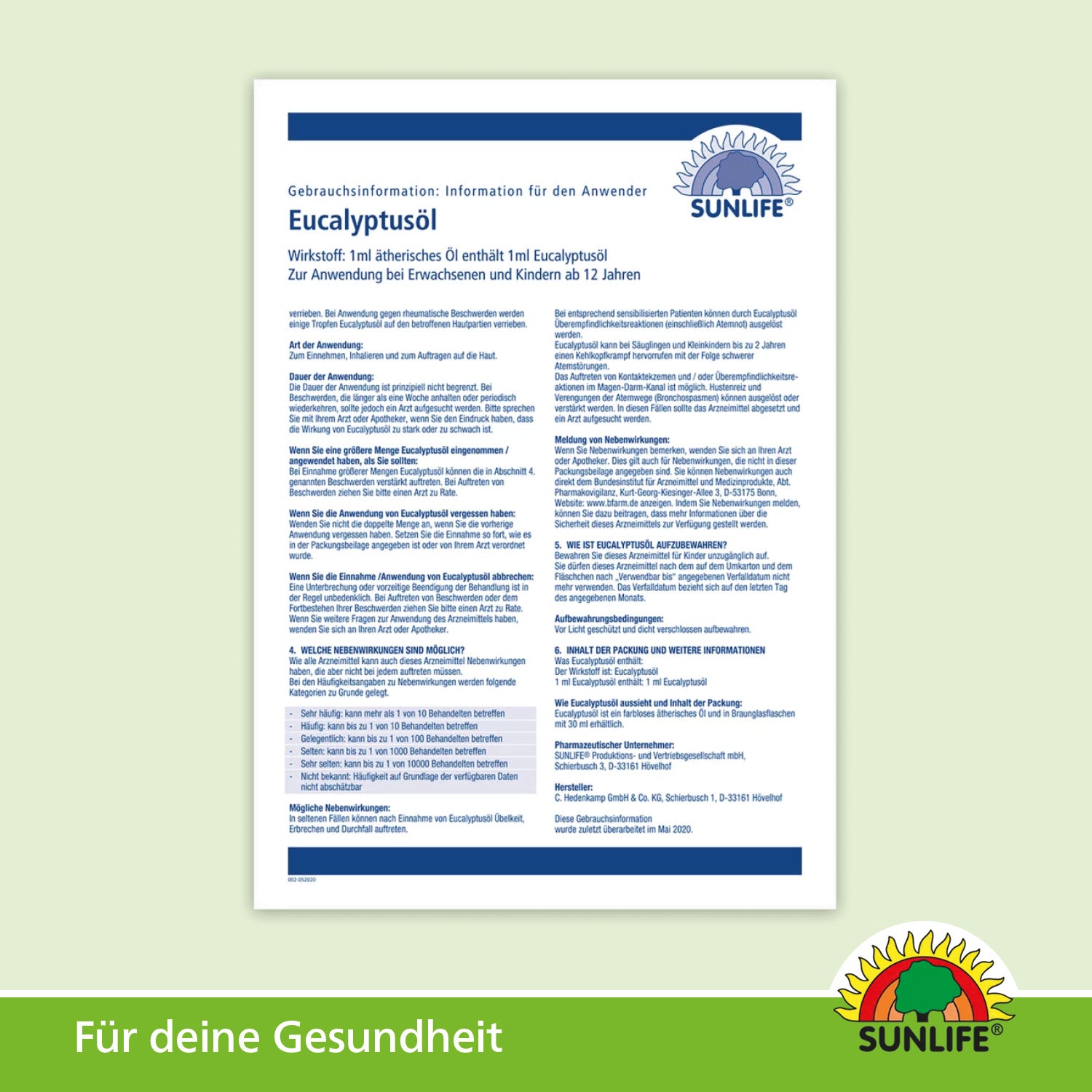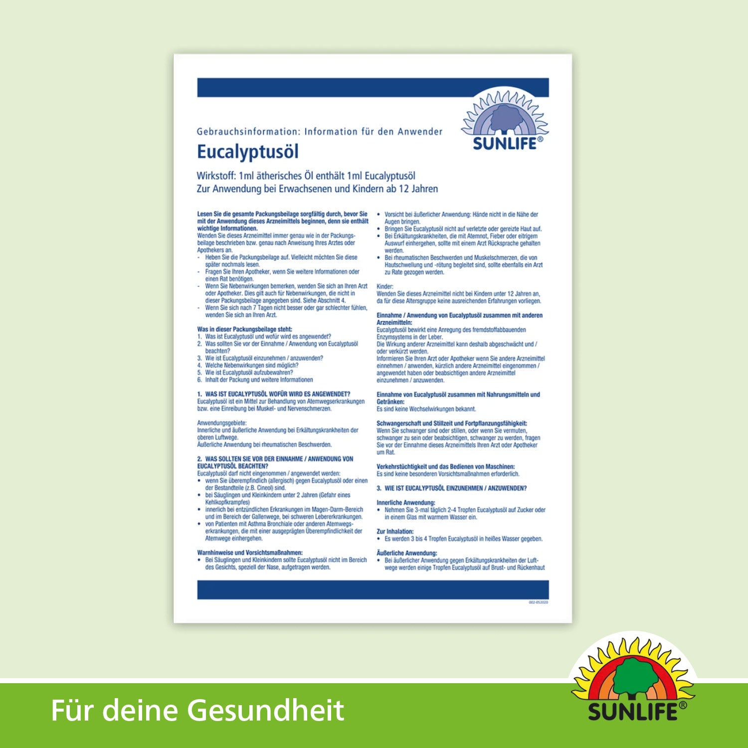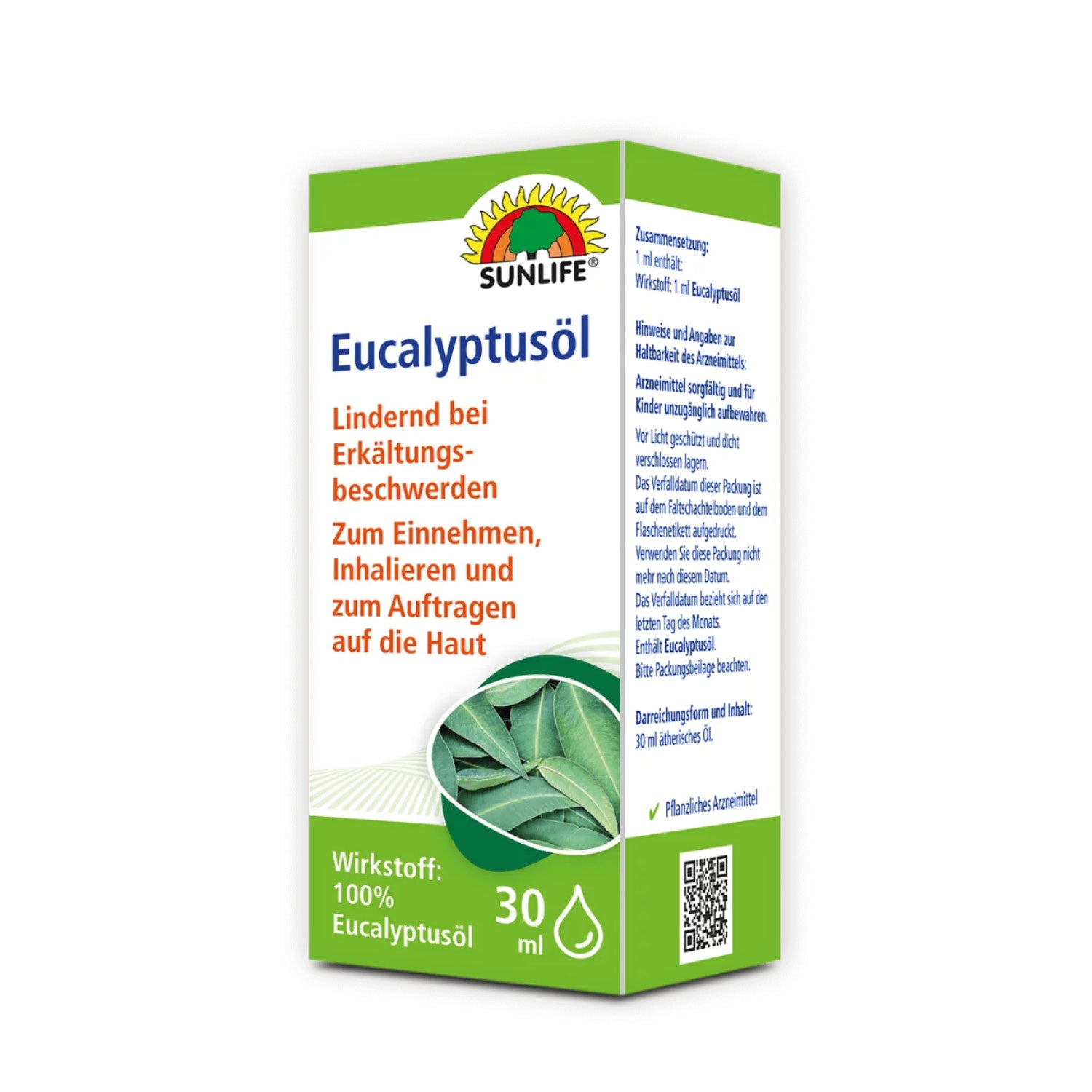 Das SUNLIFE® Eucalyptusöl mit Cineol kann vielseitig in der Selbstmedikation angewendet werden. Bei Erkältungskrankheiten kannst Du Eucalyptusöl einnehmen, inhalieren oder als Einreibung auf Brust und Rücken verwenden. Rheumatische Beschwerden lassen sich durch das Einreiben des Eucalyptusöls auf den betroffenen Hautpartien lindern.