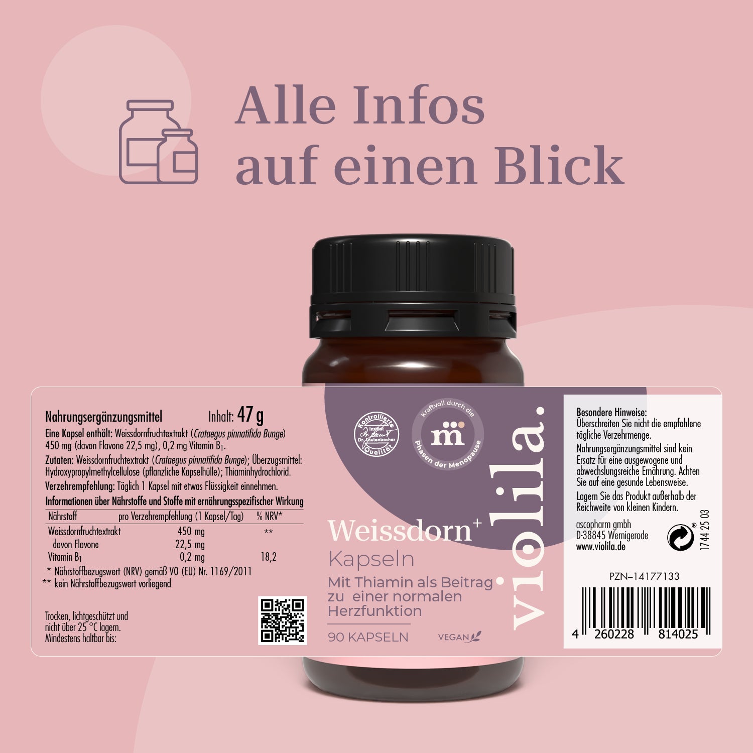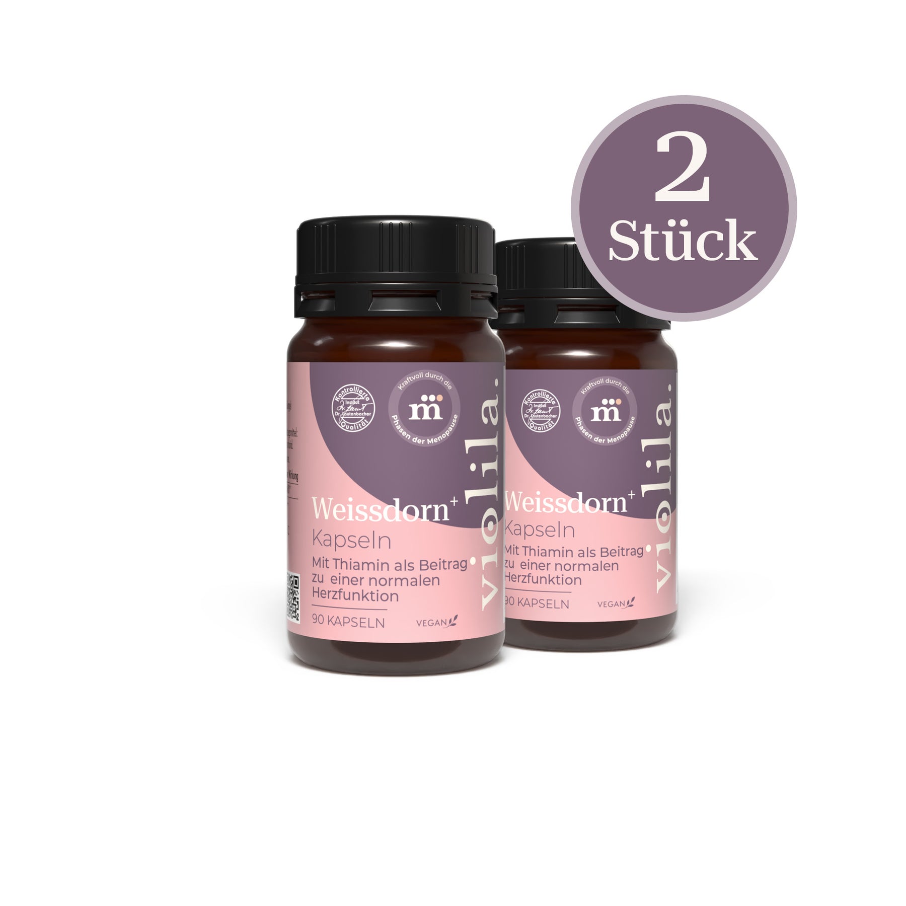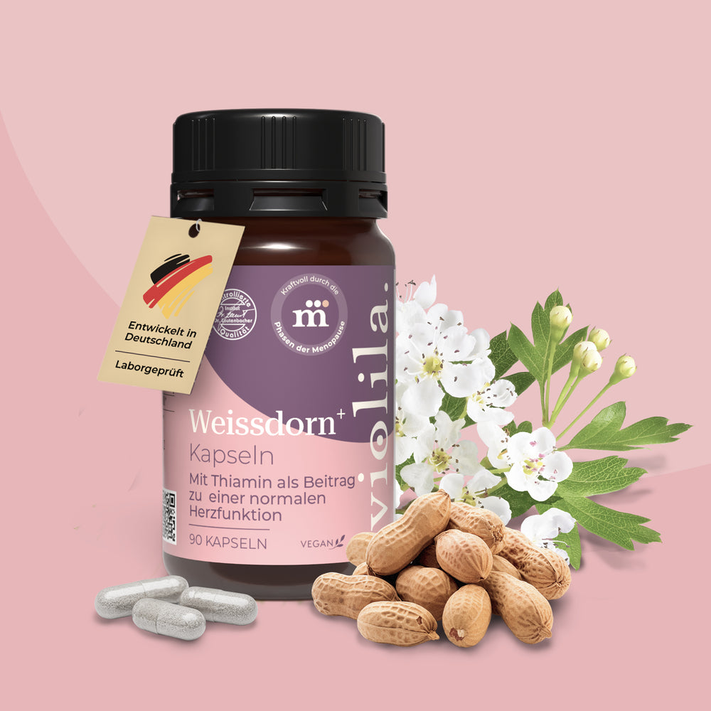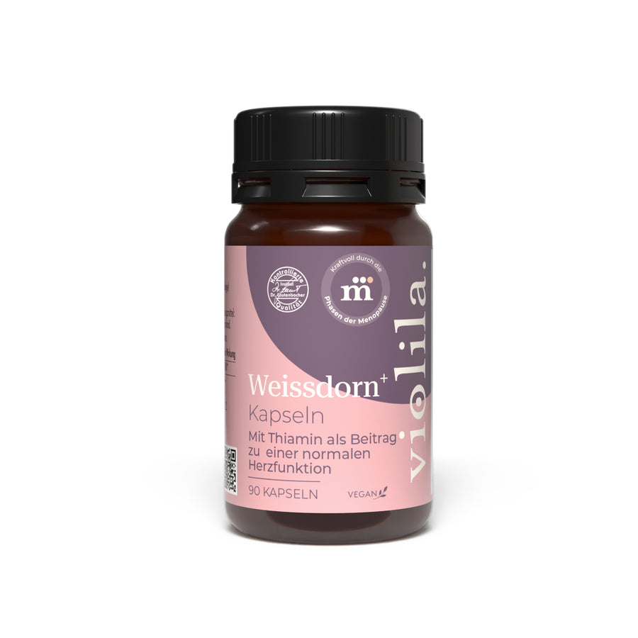 Die Weissdorn+ Kapseln von violila enthalten eine gezielte Kombination aus hochwertigem Weissdornfruchtextrakt und dem Vitamin B1 (Thiamin).