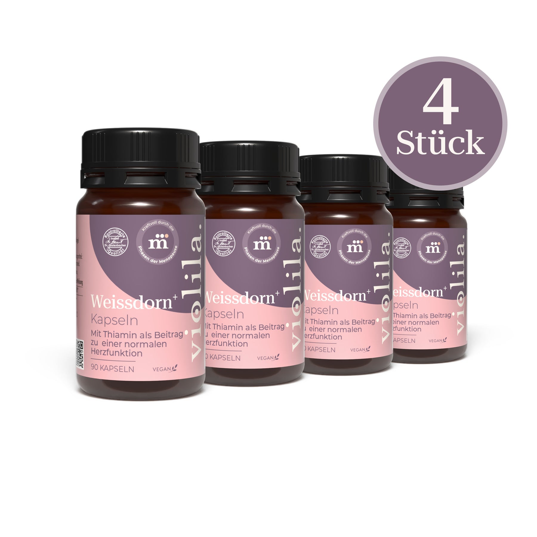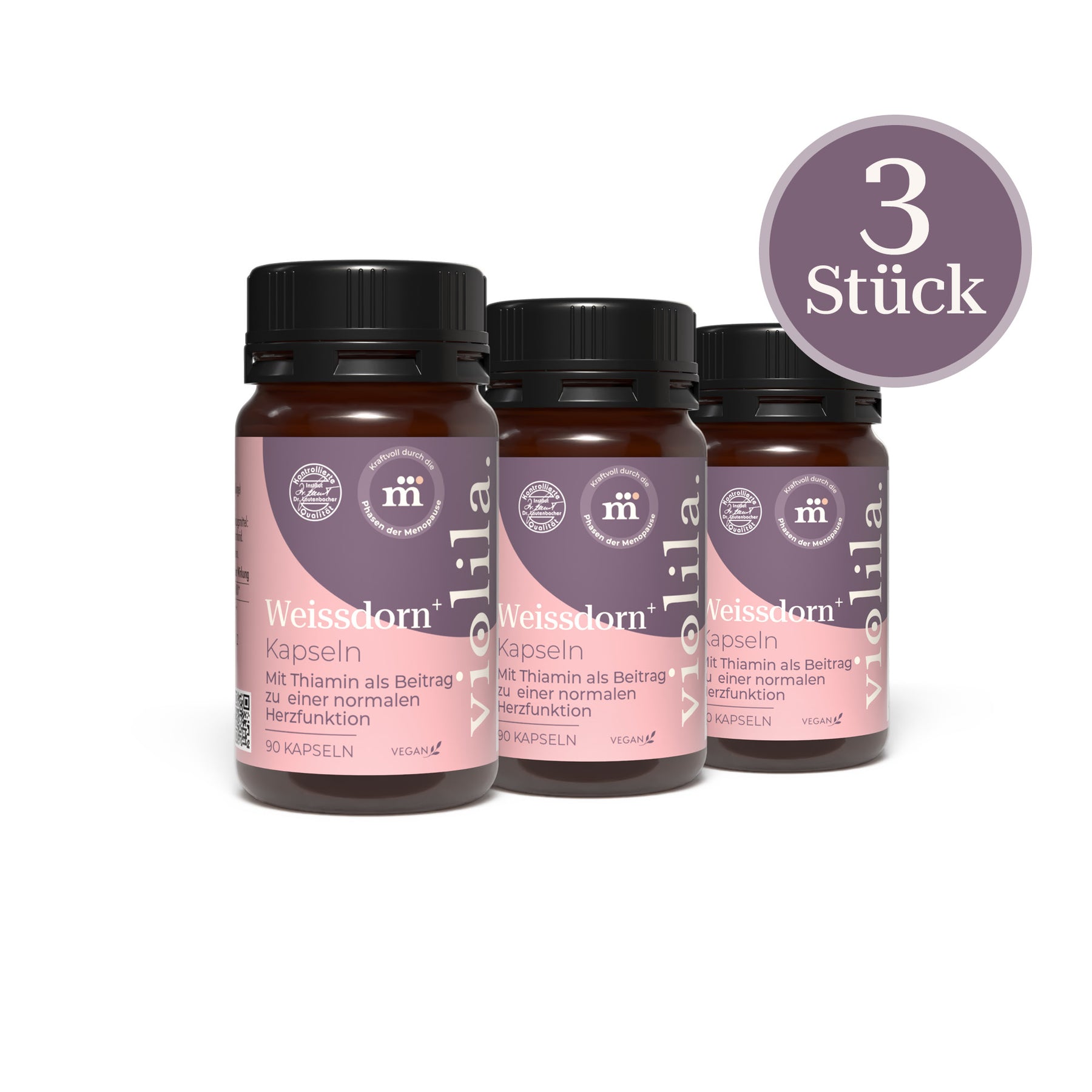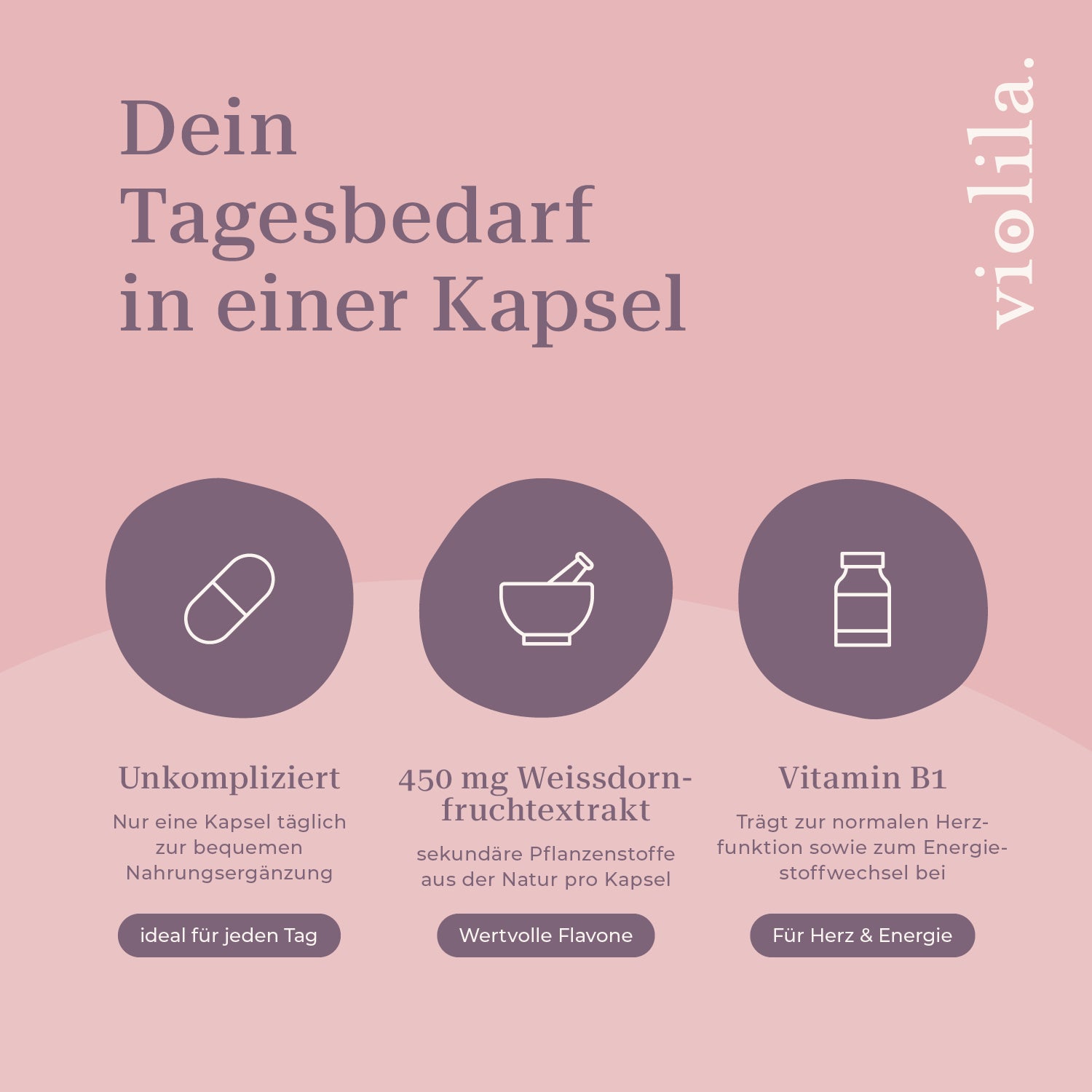 Die Weissdorn+ Kapseln von violila enthalten eine gezielte Kombination aus hochwertigem Weissdornfruchtextrakt und dem Vitamin B1 (Thiamin).